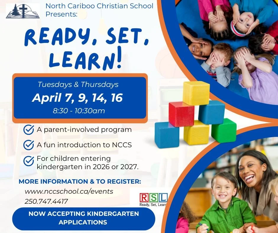 Ready, Set, Learn is a free parent-involved program for children entering kindergarten in September of 2026 or 2027. It will be held at North Cariboo Christian School at 2876 Red Bluff Road, in the new portable behind the school. Please bring a pair of indoor shoes for your child if you have them.